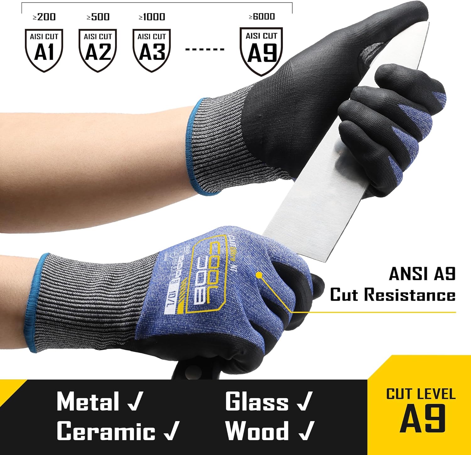 - Superior Cut Protection - Our A9 Cut-Resistant Gloves are engineered with a combination of HPPE (High-Performance Polyethylene) and metal yarn, providing the highest level of cut resistance. With an ANSI A9 rating, they can withstand the cutting force of up to 6000 grams from sharp objects, ensuring your hands remain safe.